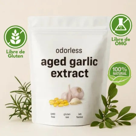 Extracto de ajo añejo natural: Ingrediente tradicional de alimentos integrales que ha sido valorado durante generaciones como parte de una vida saludable, añejado durante 24 meses para liberar la máxima potencia.